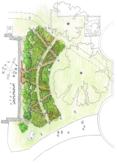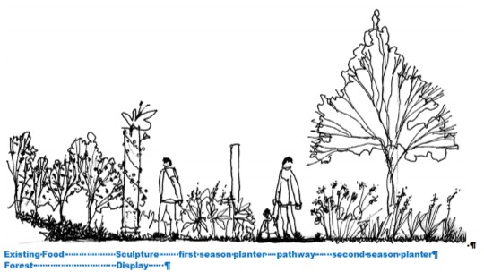 The design employs certain design features that can be used in other pathway projects so that planters can make design statements through simple incorporation of site features. In the case of this project, the dripline of the large central maple tree delivers the context for a semi-circular planter shape, while three existing young specimen trees, reinforce the arced shape and anchor the Phase-2 planter. The use of the diagonal pathways serves to connect the different phases of planting and the interpretative display in the existing food forest collection.