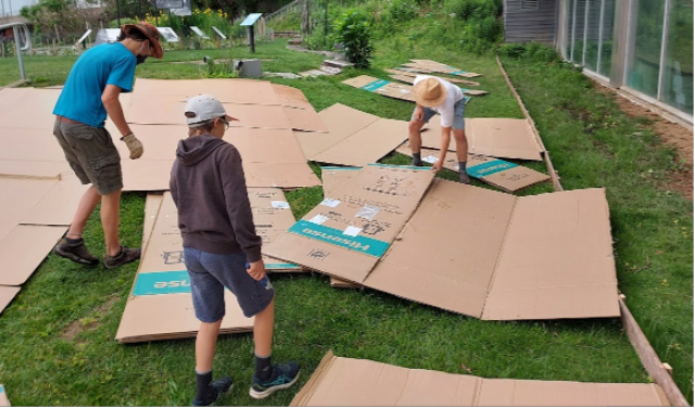 (1) The first stage is to upcycle existing cardboard which acts as a base to new top soil and a barrier to weed growth from the grass layer below.