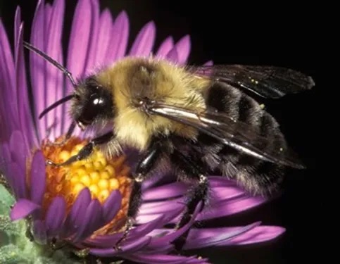 These large, furry bees are native to Canada. They build their nests underground, and unlike many other native species, they are eusocial, forming colonies of 50 to 200 workers with a single queen. Bumble bee species as a whole are generalist pollinators, meaning they are able to pollinate many different kinds of plants. In contrast to the boldly striped European honey bee, the abdomen of the common eastern bumble bee is mostly black.