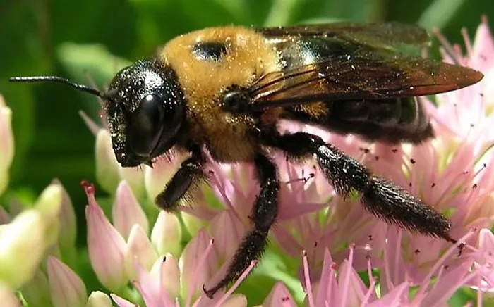 The large eastern carpenter bee can be between 2 cm to 2.5 cm long. It has a shiny black abdomen and is distinctly less fuzzy than bumble and honey bees. As the name suggests, carpenter bees nest in wood, carving tunnels up to 30 cm deep. Eastern carpenter bees do not have a queen and do not form colonies, but rather are solitary nesters.